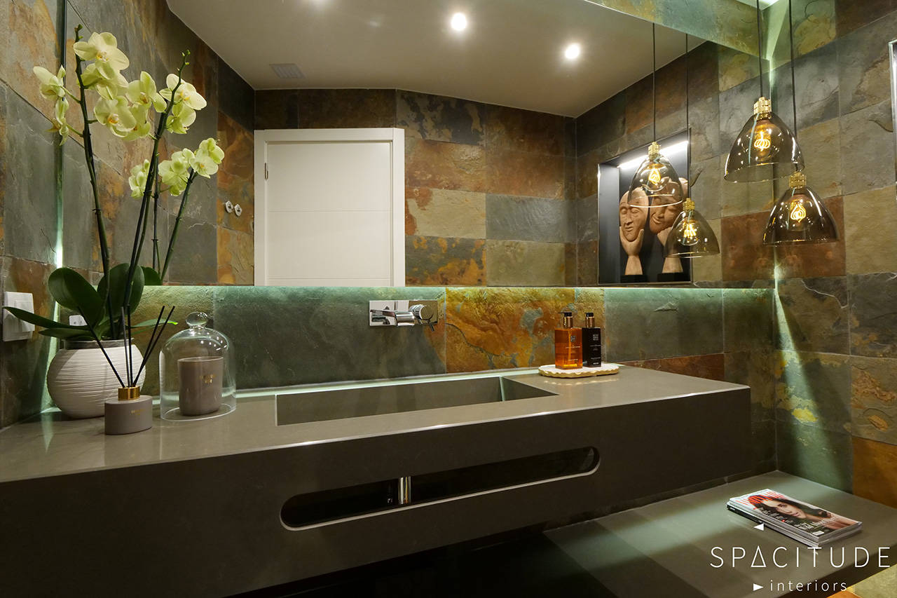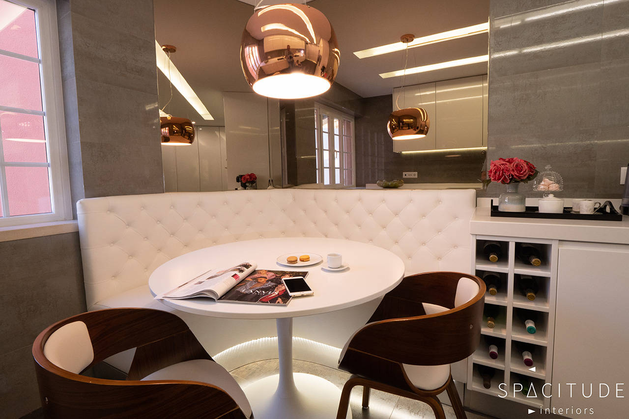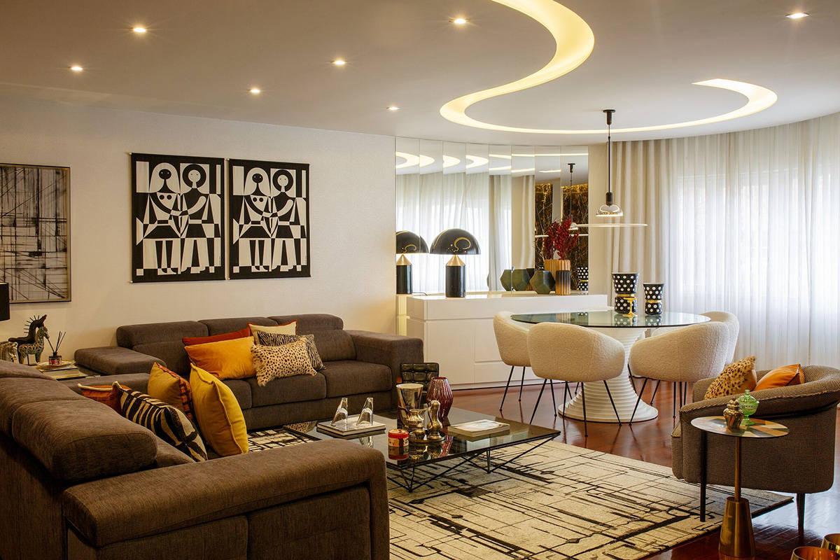 As the living room is the most noble space, the fireplace was redesigned and Pakistani marble of great aesthetic beauty was installed. On the ceiling we invested in serpentine light moldings to connect both rooms with movement.